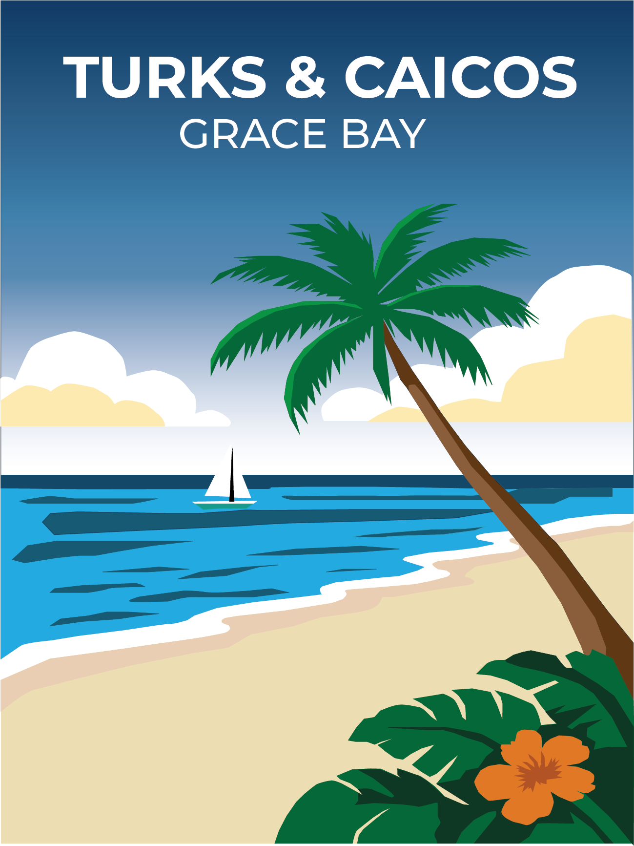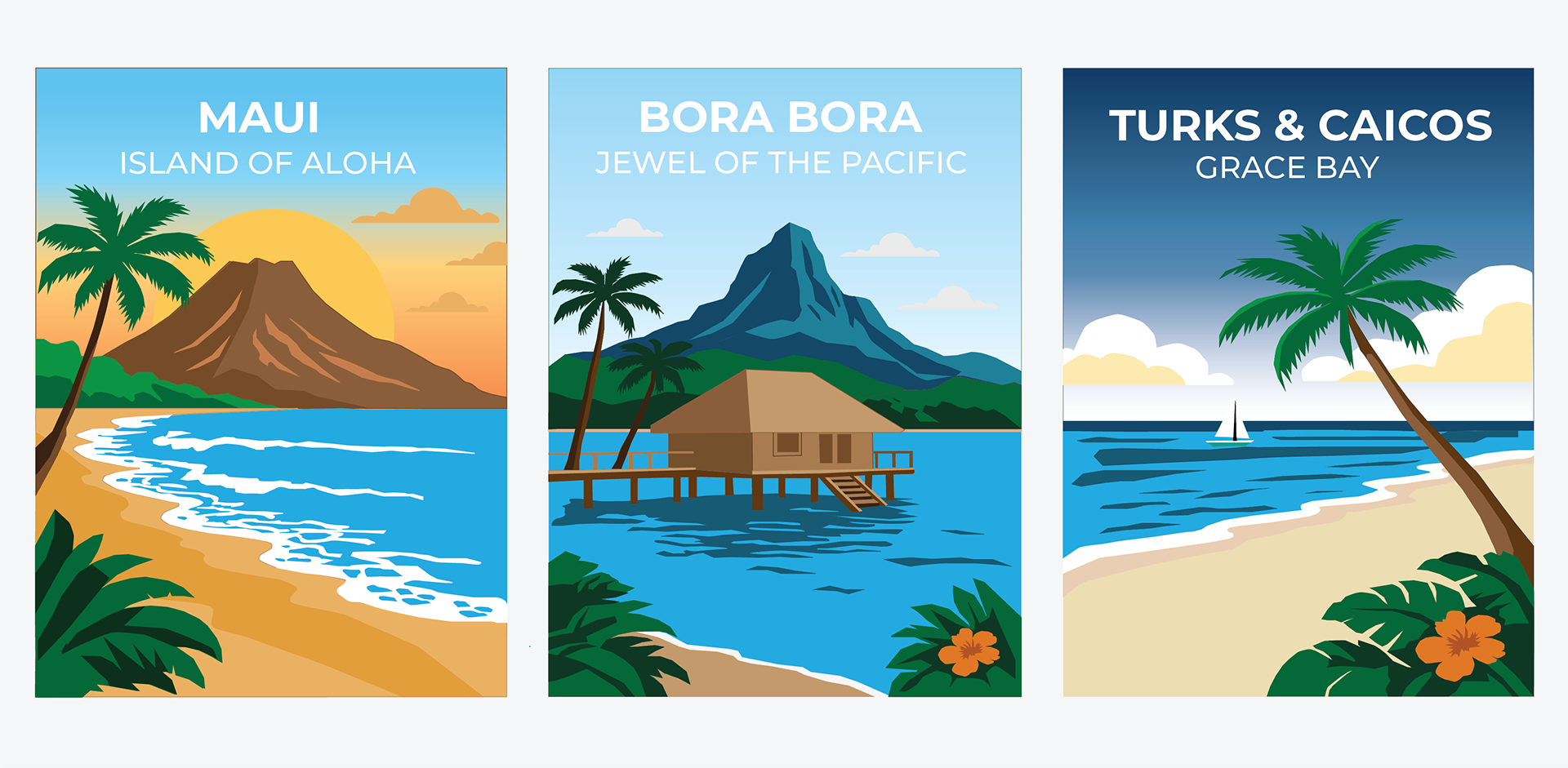 A vector-illustrated poster series inspired by Maui, Bora Bora, and Turks & Caicos.